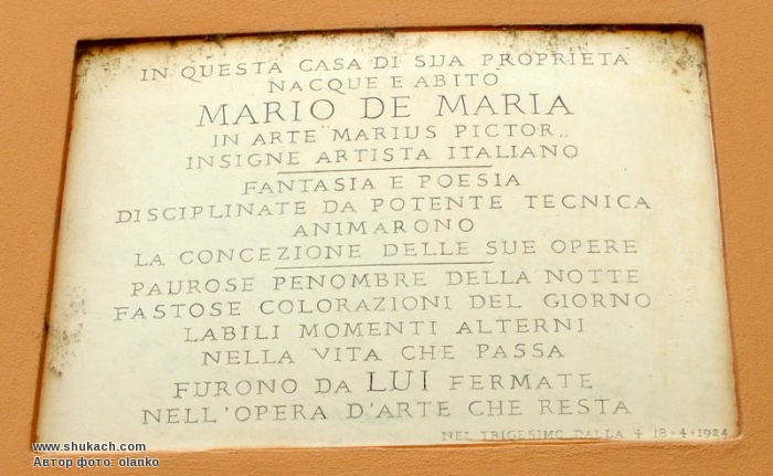 Встановлена на честь італійського художника і архітектора Маріо де Марія, який у цьому будинку народився і жив.