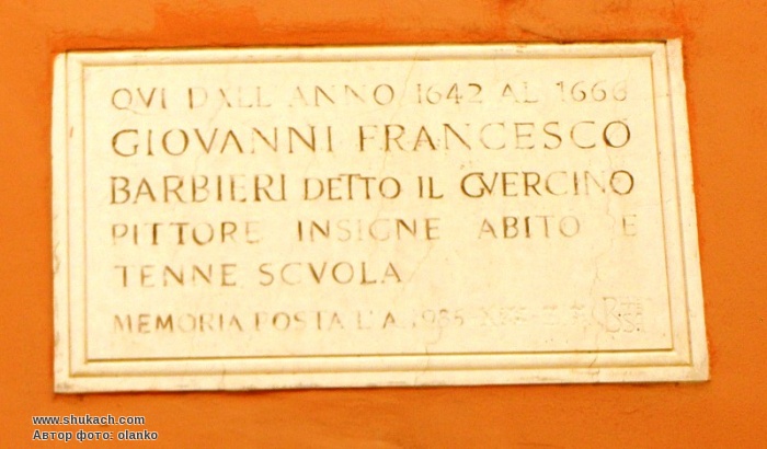Встановлена у 1985 році на честь видатного італійського живописця 17-го століття Джованні Франческо Барбьєрі, більш відомим під прізвиськом Гверчіно (що в перекладі з італійської означає «косоокий»). В цьому будинку з 1642 до 1666 року була його майстерня, де він працював і навчав учнів.