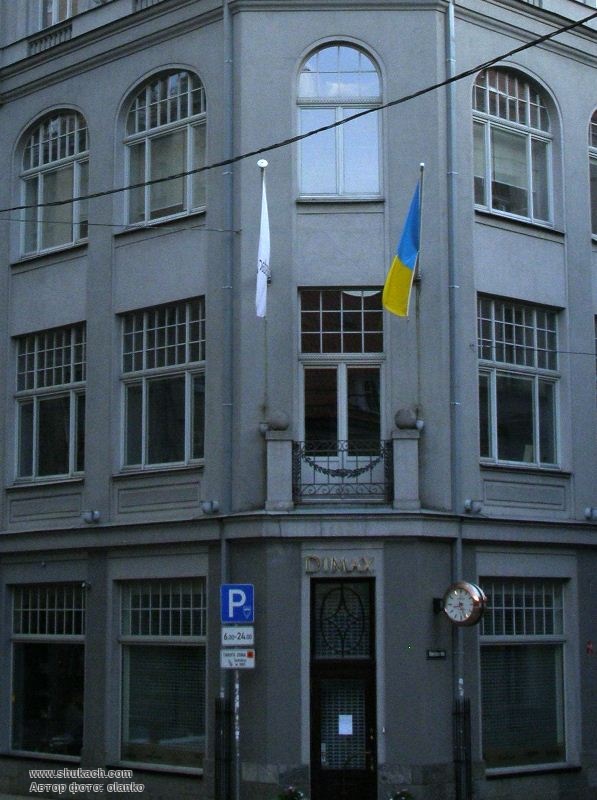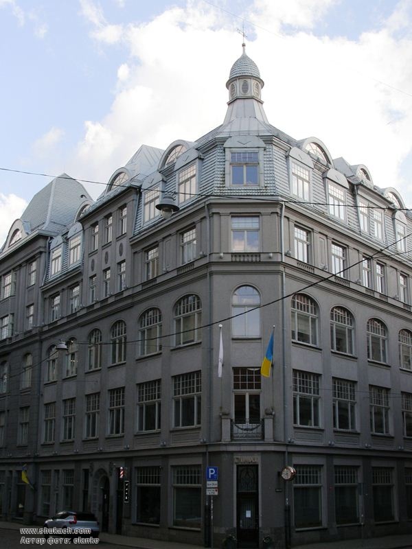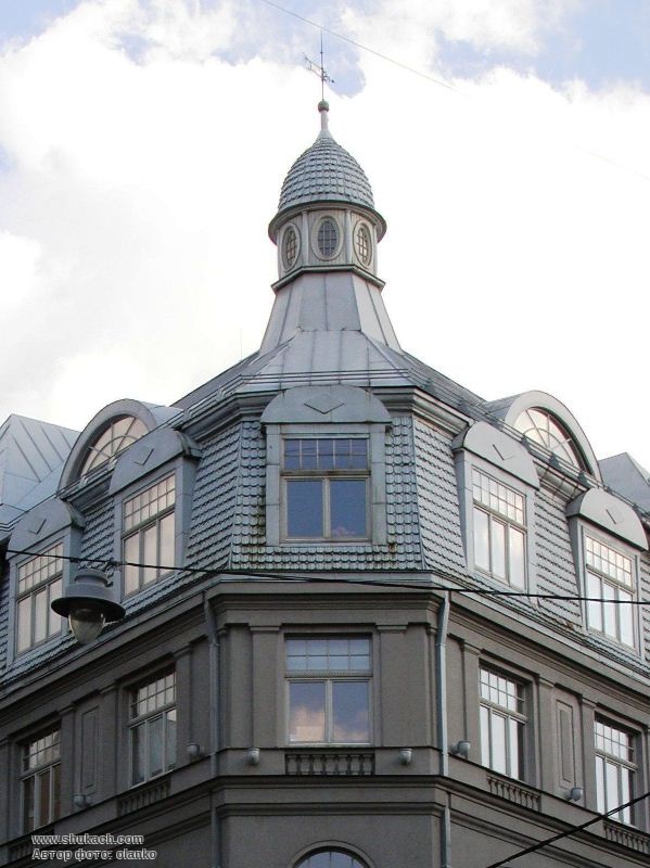 Чотириповерховий будинок з мансардним поверхом на розі вулиць Вальню і Мейстару зведений у 1912 році за проектом архітектора Герберта Тімера. Фасади прикрашені балюстрадами і рельєфними вставками. Зрізане наріжжя завершує декоративна вежа з овальними вікнами, витягнутим куполом, вкритим «лускою» і флюгером.