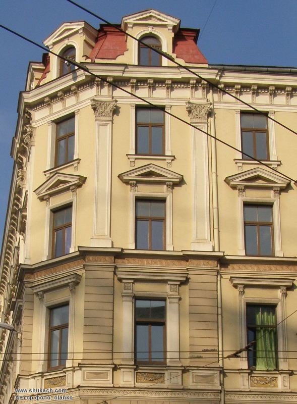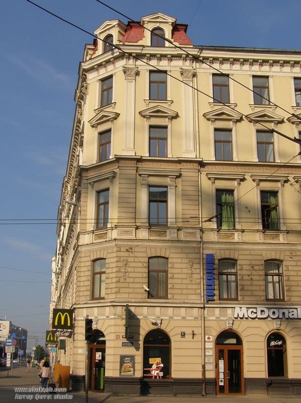 П’ятиповерховий прибутковий будинок зведений у 1880 році. Перші два поверхи рустовані. Вікна прикрашені сандриками – на третьому поверсі прямими, на четвертому трикутними; вузькими пілястрами, ліпними гірляндами. Зрізане наріжжя увінчує купол з трьома вікнами. Пам’ятка архітектури.