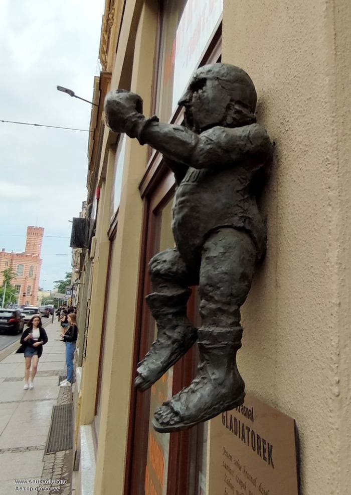 Гладіаторек не боїться жодного бою, у нього на голові шолом. Рукавички боксерські на руках. Його можна знайти біля входу в магазин Гладіатор.
