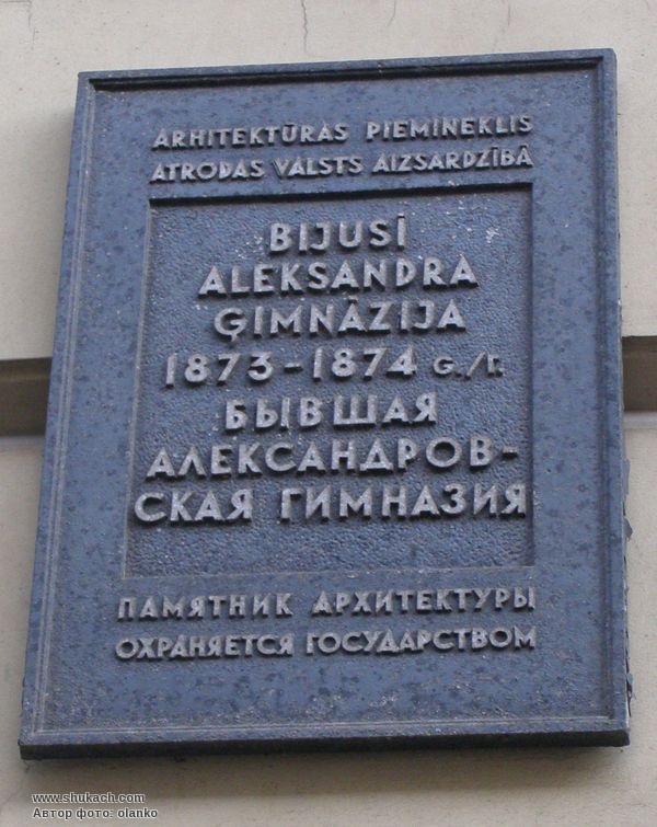 Велика двоповерхова будівля у псевдоренесансному стилі зведена у 1873-1875 роках за проектом архітектора Я.-Ф.Бауманіса для розміщення Олександрівської гімназії. Фасад прикрашений профільованими пілястрами, ліпними розетками, вінками і гірляндами. Зараз тут розташована Латвійська музична академія. Пам’ятка архітектури національного значення.
