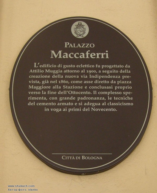 Будівлю в еклектичному стилі було спроектовано Аттіліо Муджа після створення нової Віа Індіпенденца, запланованої ще в 1860 році як пряма вісь від площі П'яцца Маджоре до вокзалу. Аттіліо Муджа, визнаний одним із найоригінальніших італійських архітекторів та інженерів, спроектував будинок наприкінці дев'ятнадцятого століття. У його роботах конструктивна строгість поєднувалася з архітектурною якістю та креативністю, з використанням нових технологій та інноваційних матеріалів, таких як залізобетон. Власником будівлі був інженер Джузеппе Маккаферрі, який разом з Аттіліо Муджа спроектував будівництво. Перший камінь було закладено 6 квітня 1896 року, а роботи тривали лише рік.