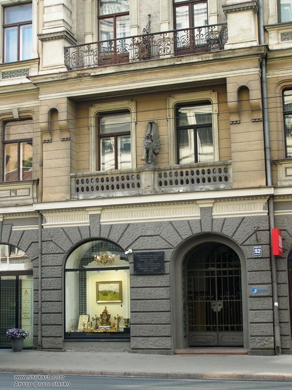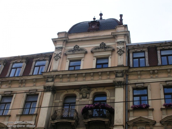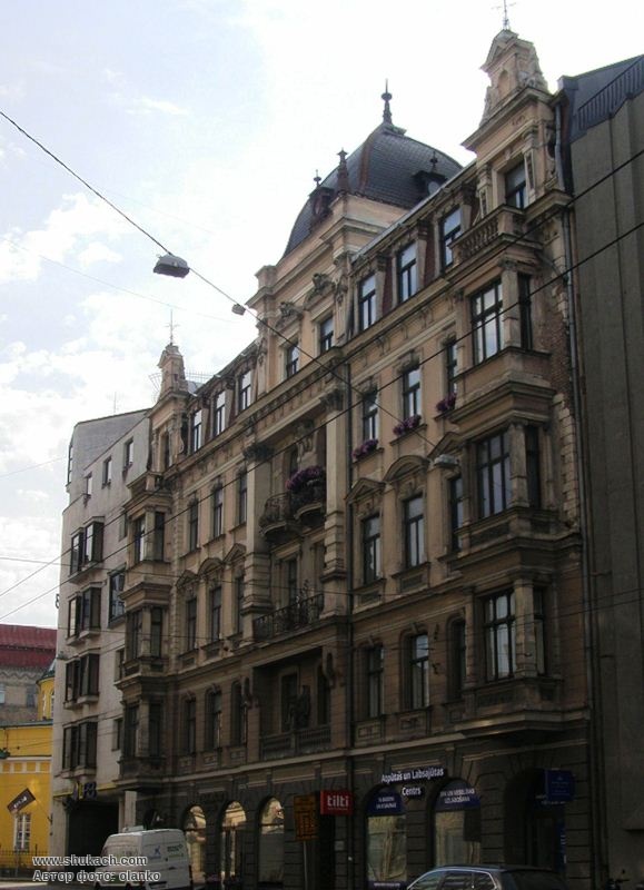 П’ятиповерховий прибутковий будинок в стилі модерн зведений у 1902 році за проектом архітектора Альфреда Ашенкампфа. Перший поверх рустований. Фасад прикрашений різноманітною ліпниною – рельєфними вставками, гірляндами, маскаронами, акантами. Центральний ризаліт завершується великою вежею з куполом, критим «лускою». По бокам – дві маленьких вежки. Балкон другого поверху прикрашає скульптура грифона. Балкон третього поверху має ковані грати з вензелем власника. Вікна третього поверху мають трикутні і лучкові сандрики. Пам’ятка архітектури.