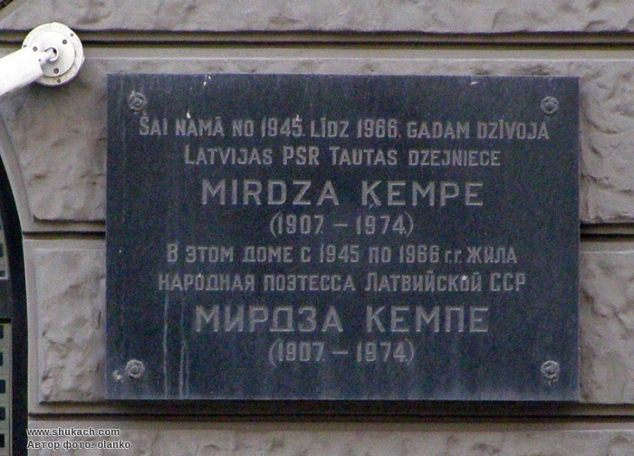 Встановлена на честь латиської поетеси Мірдзи Кемпе, яка жила і працювала в цьому будинку у 1945-1966 роках.