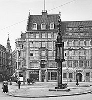 До 1909 року тут були дві ділянки з середньовічними кам’яницями. Від будинку 27 збереглися фрагменти стіни XIV-XV ст. Будинок відомий як Seidel'sches Haus (Будинок Зайделя), був побудований в три поверхи. Кутова кам'яниця № 28 (нім. «An der Kornecke») середньовічного походження. У 1466–1483 роках тут існувала міська виноробня. Близько 1909 року фірма Bernhard Joseph Grund, оголосила конкурс на розробку проекту. Тоді народився план з’єднати будинки. Будівельні роботи розпочалися в 1913 році. Будинки були знесені, а на їх місці зведено чотириповерховий будинок Отриманий житловий і комерційний будинок під назвою «Goldener Becher» був покритий високим двосхилим дахом. Війна 1945 року пошкодила кам'яниці. Будівлю було перебудовано посилаючись на форми приблизно 1600 року. Його проектувальниками були Януш Бахмінський та Юзеф Рахвальський під керівництвом Марціна Буковського.