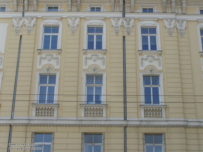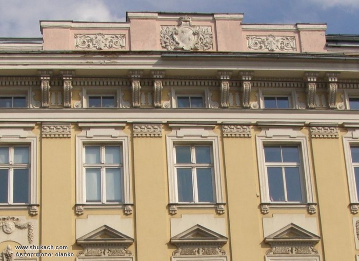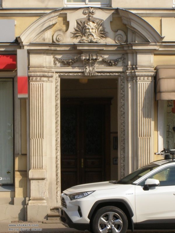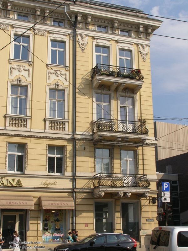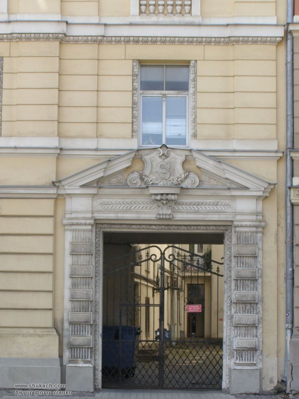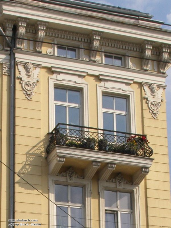 Чотириповерховий прибутковий будинок. Два перших поверхи мають горизонтальний руст. Фасад багато прикрашений балконами з кованими гратами і різноманітною ліпниною: гірляндами, барельєфами, маскаронами. Центральний фронтон має картуш з гербом власника. Вхідний портал прикрашений профільованими пілястрами, гірляндами і великим чоловічим маскароном.