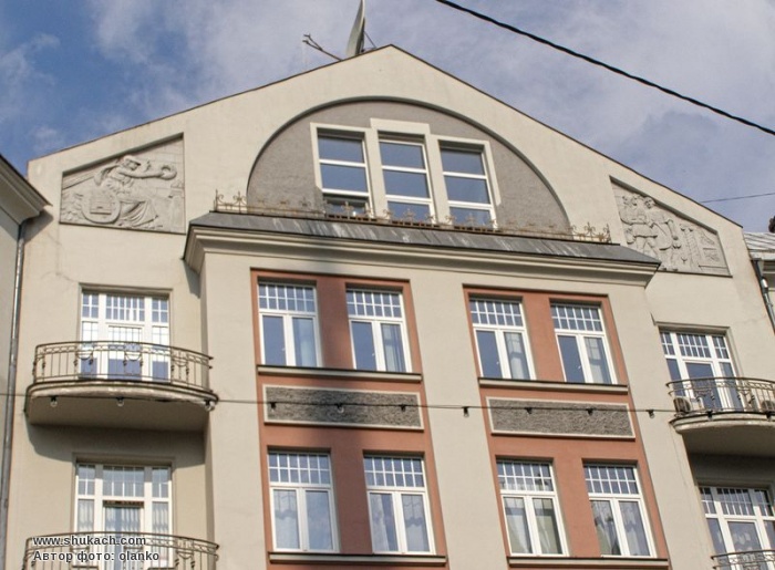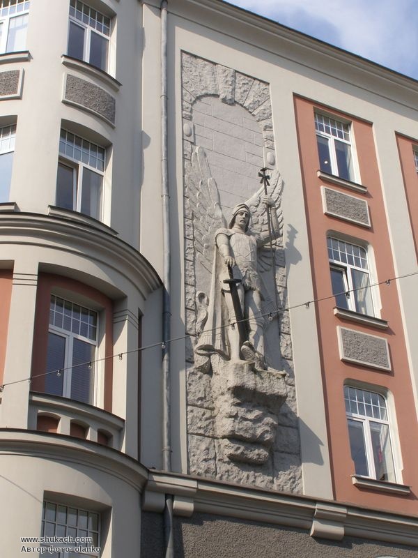 П’ятиповерховий прибутковий будинок складної конфігурації зведений у 1908 році за проектом архітектора Пауля Рібензама. Фасад прикрашає велика скульптура архангела Міхаїла. Наріжжя оформлене напівкруглим еркером з декоративною вежкою. Фронтон правої частини будинку має дві великих барельєфних вставки. Пам’ятка архітектури.