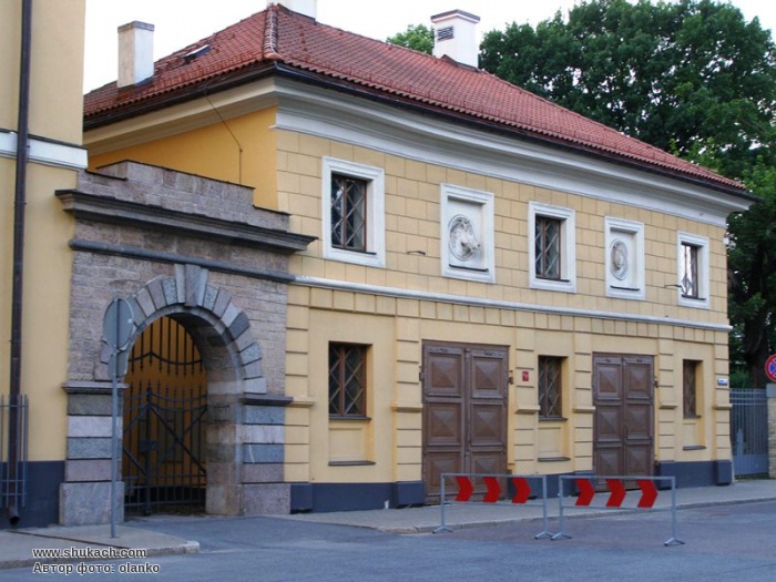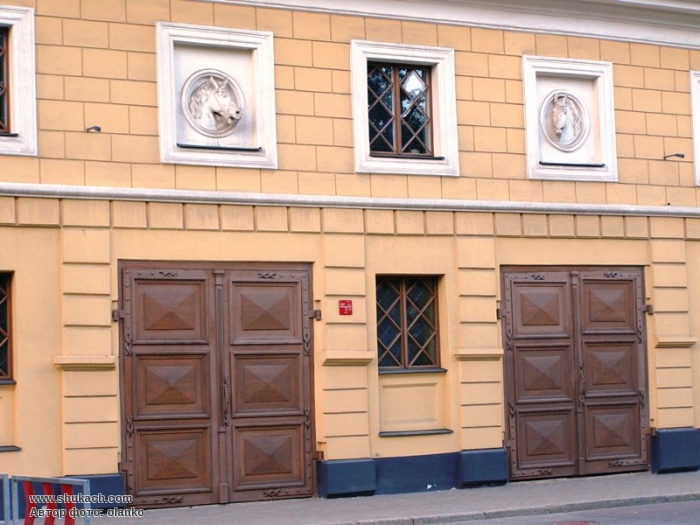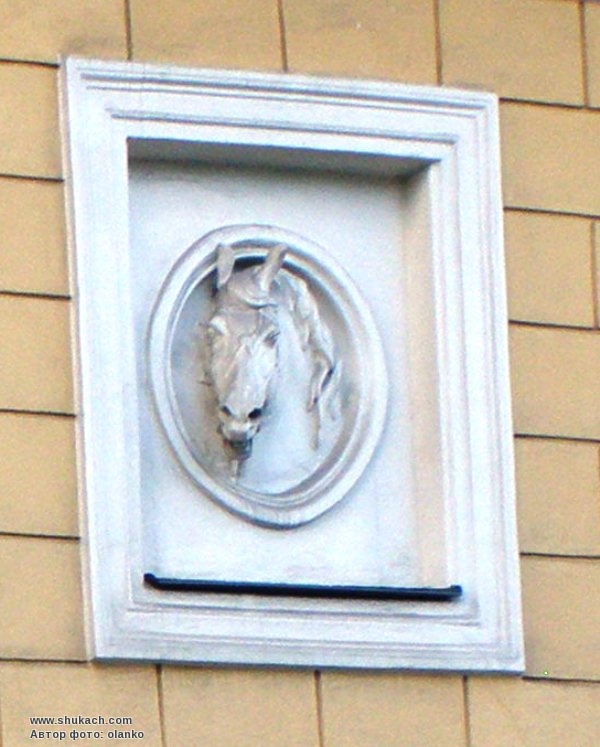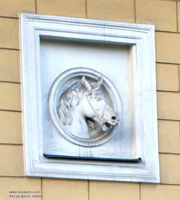від замка. Фасад прикрашають два горельєфи з головами коней.