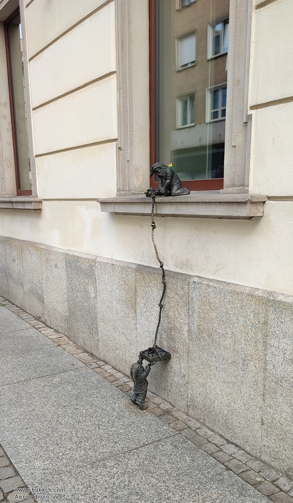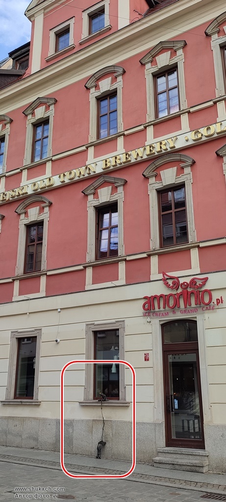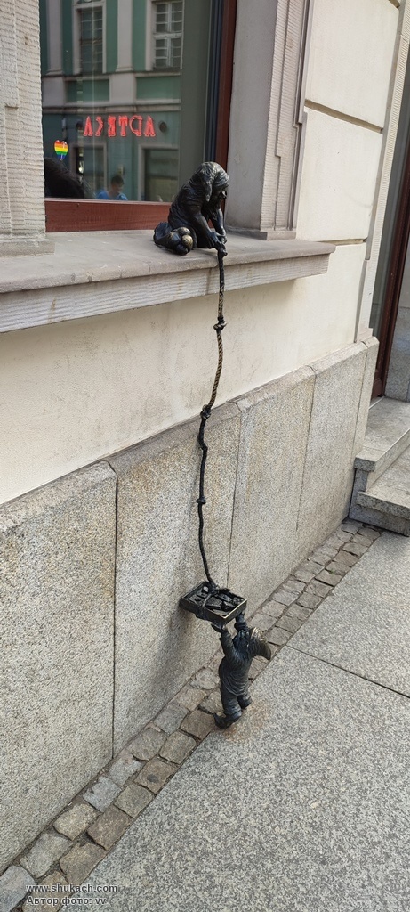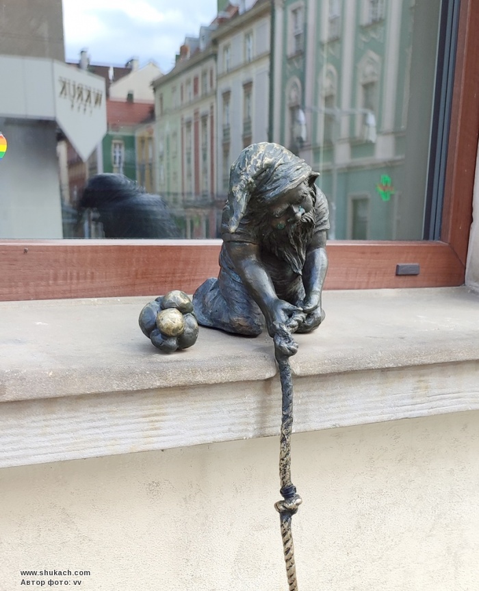 Гноми Ciastuś i Amorinek біля вікна кафе Аморіно на площі Ринок у Вроцлаві. Вони передають в кафе різні смаколики. Автор солодкої парочки гномів - Beata Zwolańska-Hołod.