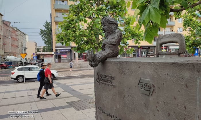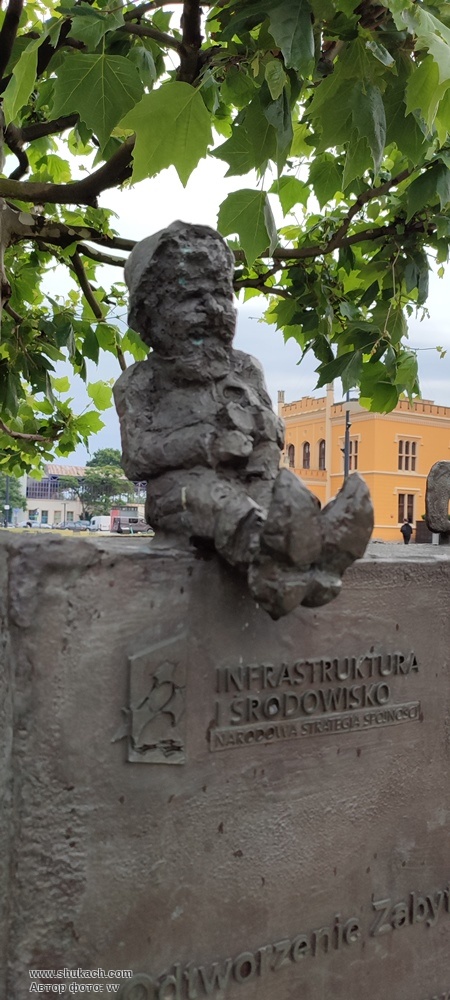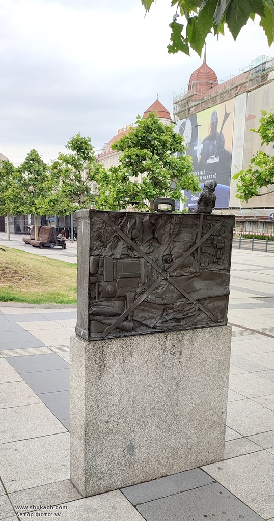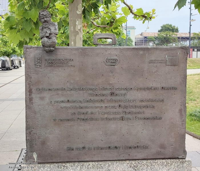 На залізничній станції Вроцлава є не менше чим три різних гномики: один з них сидить на величезній валізі (цікаво, що там у нього всередині) і чекає на свій поїзд. Другий лежить на траві, можливо, він просто планує подорож. Третій мчить з валізою якомога швидше, щоб встигнути на потяг, який скоро відходить.