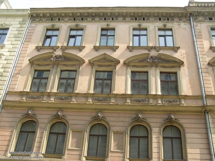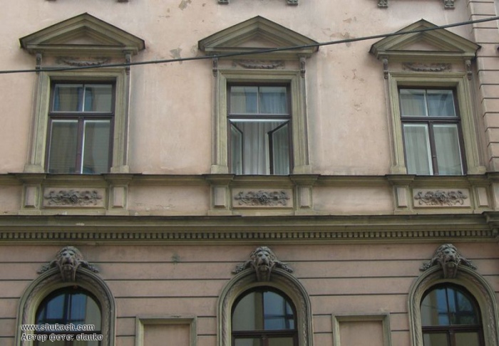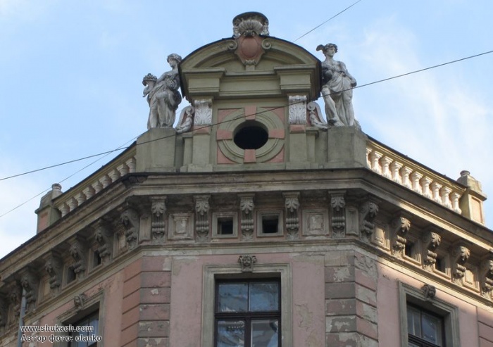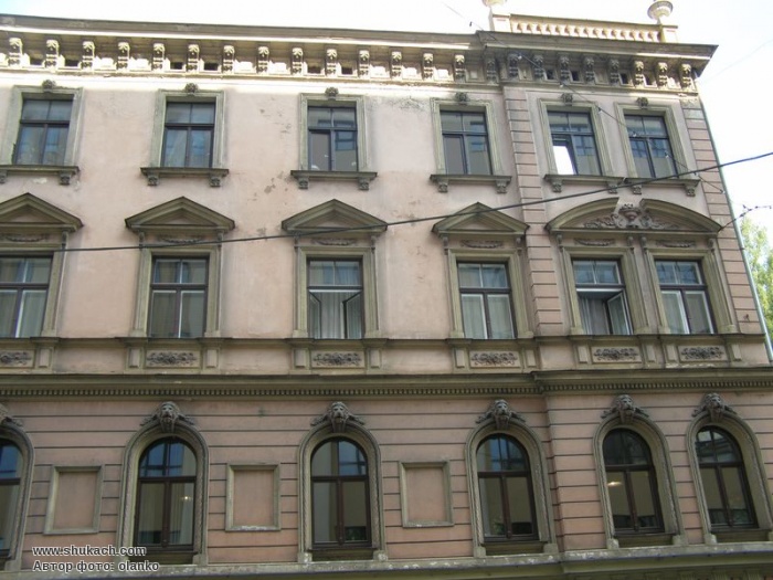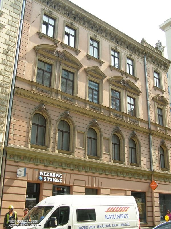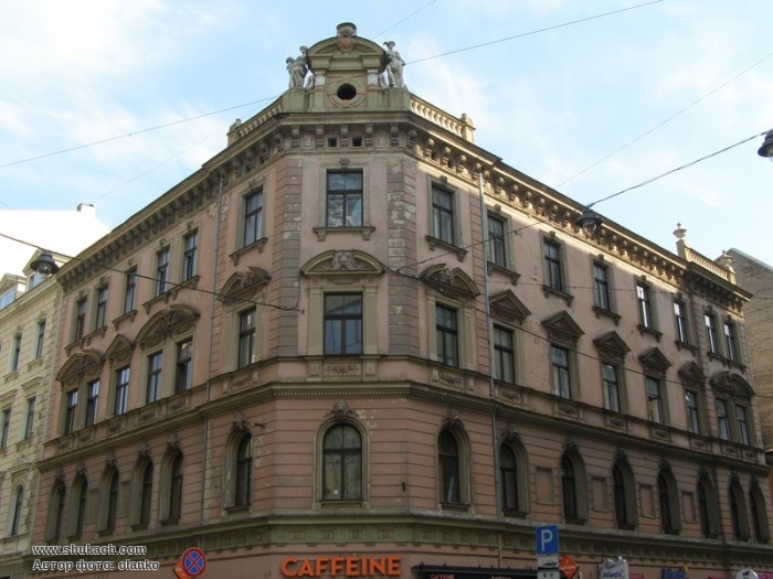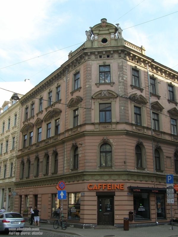 Чотириповерховий прибутковий будинок в еклектичному стилі на розі вулиць Базніцас і Дзірнаву зведений у 1897 році за проектом архітектора Константіна Пекшенса. Два перших поверхи рустовані. Вікна другого поверху аркового типу, з лев’ячими маскаронами. Вікна третього поверху мають трикутні або лучкові сандрики. Зрізане наріжжя завершено скульптурною групою і балюстрадою.