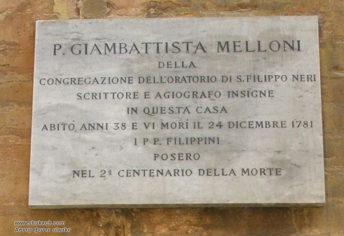 Отець Джамбаттіста Меллоні, автор житія святого Домініка, 38 років служив в цій церкві і помер тут 24 грудня 1781 року. Дошка урочисто відкрита у 1981 році, році 200-річчя зі смерті священика.