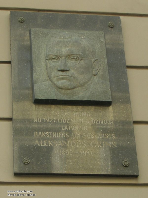 Встановлена на честь латиського письменника і воїна Александрса Грінса, який жив і працював в цьому будинку у 1927-1934 роках. Бронзовий барельєф на гранітній плиті.