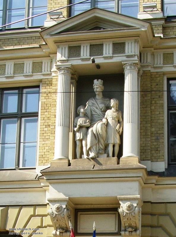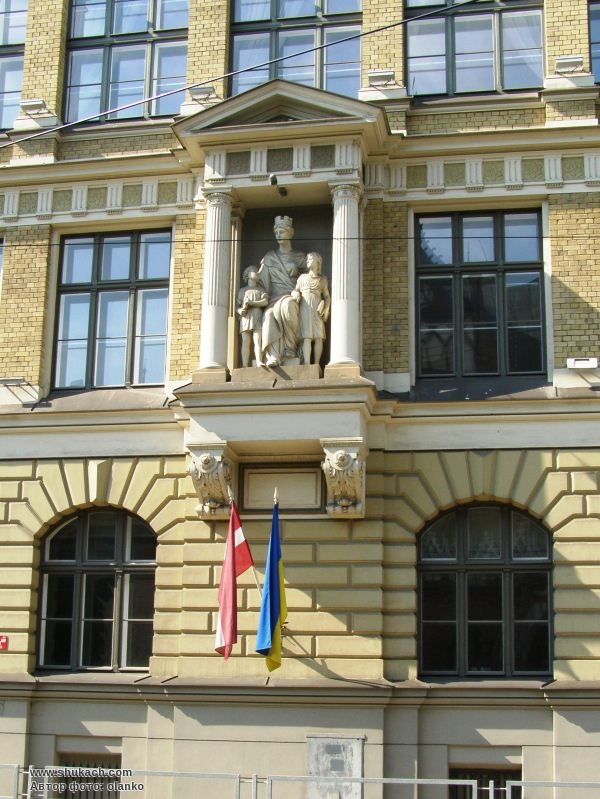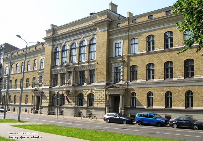 У 1884 році за проектом ризького міського архітектора Райнхорда Георга Шмелінга було збудовано нинішню будівлю школи з 12 класними кімнатами, кожна з яких була розрахована на 60 учнів, широким холом з галереями, квартирами для директора школи та інших вчителів, а також менші приміщення під вчительські і кабінети. На фасаді школи алегорично зображено місто Рига (жінка, голова якої прикрашена короною) з хлопчиком та дівчинкою.