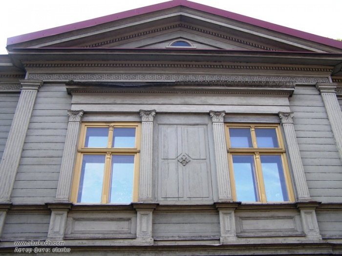 Цей багатоквартирний двоповерховий дерев’яний будинок має центральний ризаліт, прикрашений профільованими пілястрами і смугою меандрового візерунку під карнизом. Два входи до будинку винесені на фланги фасаду.