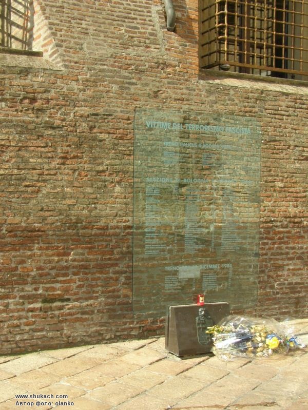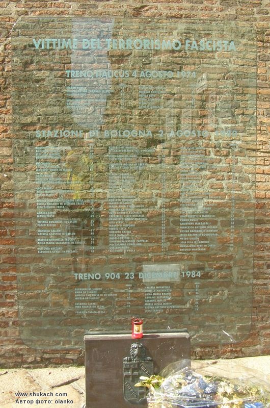 Скляна плита, на якій в дві колонки з позначенням віку вказані імена мирних громадян, які загинули в результати терористичних актів італійських неофашистів 4 серпня 1974 року (вибух в поїзді Італікус), 2 серпня 1980 року (бомба на Болонському залізничному вокзалі) і 23 грудня 1984 року (вибух у поїзді № 904). Знизу плита зафіксована у бронзовому тримачі з гербом Болоньї.