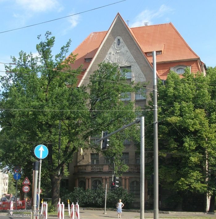 Зведена у 1908 році за проектом архітекторів В.Реслерса і Бланкенбурга для розміщення ломбарду. Реконструйована у 1930 році. Високий фронтон містить рельєфний герб Риги і зображення орлів. Спереду – велика напівкругла тераса з балюстрадою. Зараз в будівлі розміщений Державний історичний архів Латвії. Пам’ятка архітектури.
