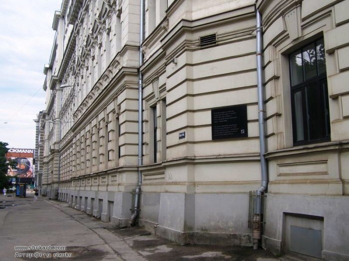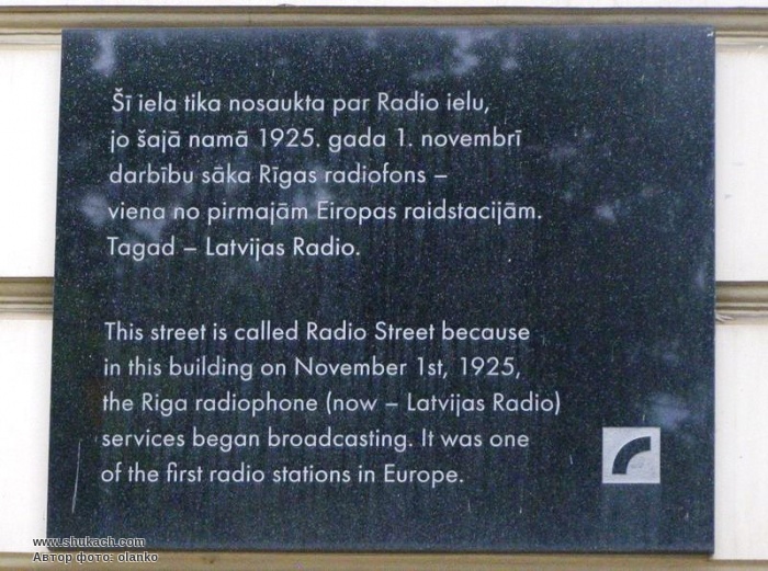 1 листопада 1925 року тут відбувся перший вихід в ефір Латвійського радіо ( на той час станція «Рига радіофон»). Зараз вулиця носить назву Радіо. Текст латиською і англійською мовами.