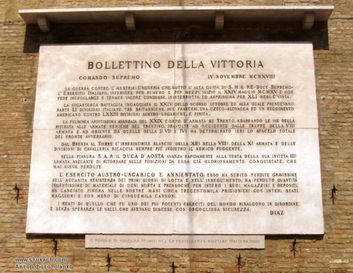 Бюлетень Перемоги (телеграма Верховного Головнокомандування від 4 листопада 1918 року за підписом Діаса, що повідомляє про поразку австро-угорської армії наприкінці Першої світової війни). Його копії є в багатьох містах Італії, і цікавий факт полягає в тому, що не всі ці копії є абсолютно ідентичними. Велика мармурова дошка встановлена на стіні Палаццо Комунале.