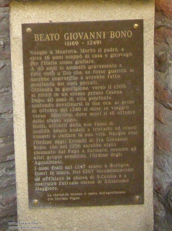 Засновник ордену пустельників блаженний Джованні Боно (1168-1249). Бронзова скульптура на кам’яному постаменті встановлена на території ораторія святої Чечілії. На передній грані постаменту закріплена бронзова пластина з описанням життя Беато Джованні Боно. Автор – отець Стефано Піджіні, чернець-августинець і скульптор.