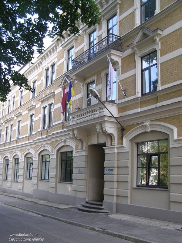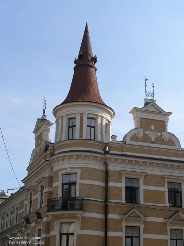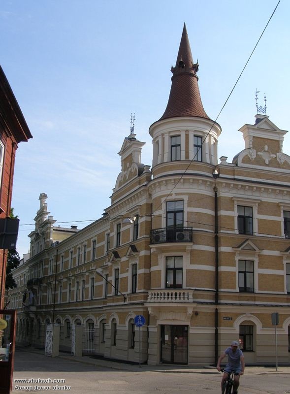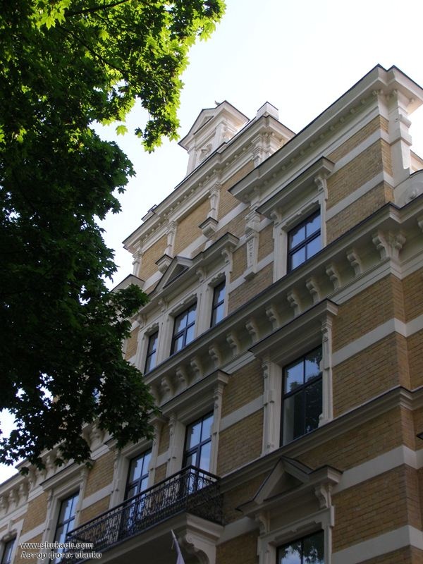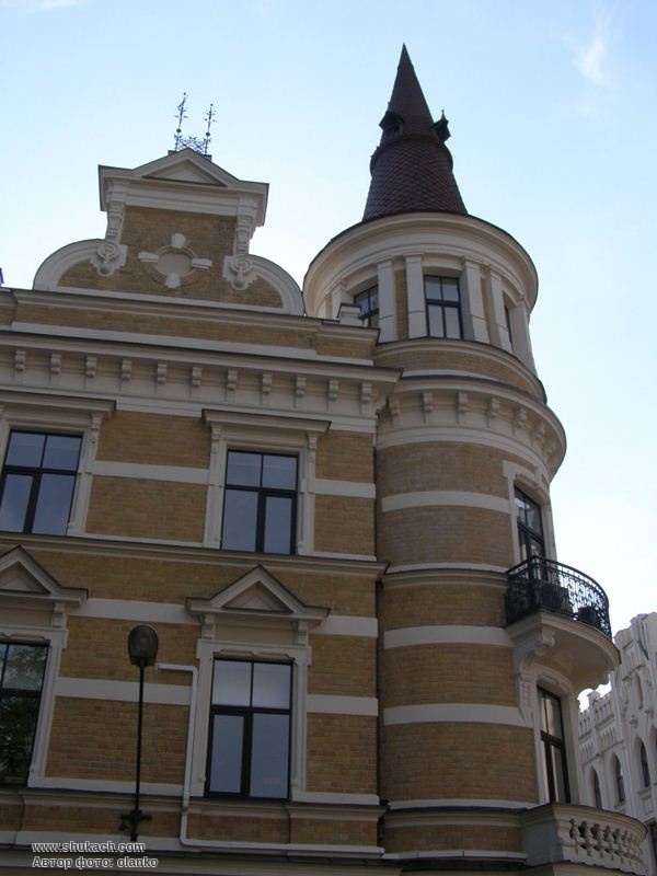 Прибутковий будинок у еклектичному стилі, з декоративними вежами, балконами та ліпними прикрасами зведений у 1896-1897 роках за проектом архітектора Альфреда Ашенкампфа на замовлення Ю.Ганшкіневіта. Зараз це – головний корпус Університету бізнесу, мистецтв і технологій.