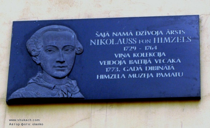 Бронзовий рельєфний портрет на гранітній дошці. Встановлений на честь лікаря, бібліофіла і колекціонера Ніколауса фон Хімцельса, колекції якого стали основою найстарішого музею Балтії. В цьому будинку він жив. Здобув освіту в Ризькій Домській школі. Вивчав медицину в університетах Кенігсберга та Геттінгена. Ніколаус тривалий час жив у Європі та продовжував поповнювати сімейну колекцію. Пристрасть до колекціонування він успадкував від свого діда, доктора Давида Мартіні, першого фізика міста. Його інтереси включали нумізматику, колекціонування історичних, передусім середньовічних, предметів.