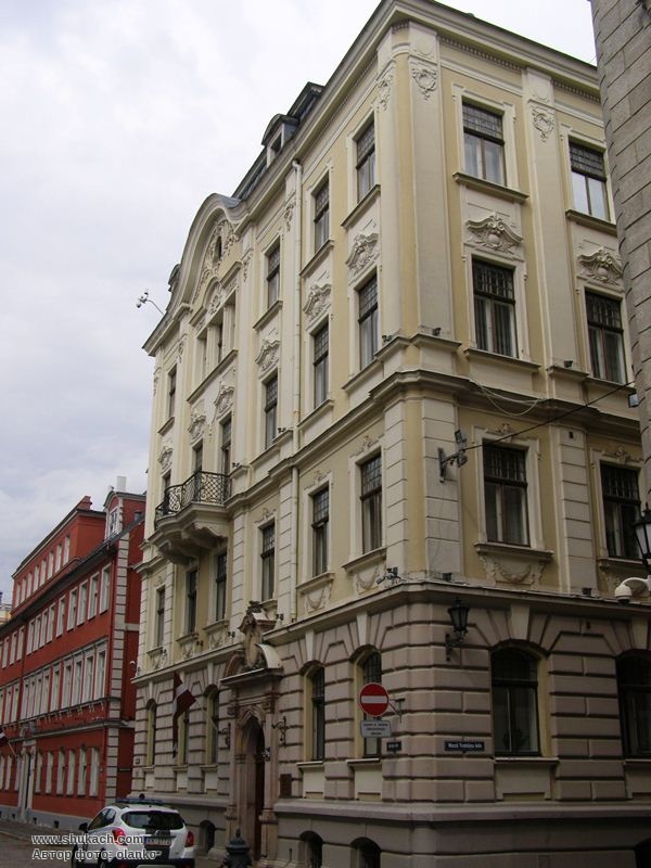 Чотириповерховий будинок в стилі неоренесанс зведений у 1907 році за проектом архітектора Вільгельма Неймана на замовлення організації Ліфляндського лицарства для розміщення канцелярії. Перший поверх рустований. Фасад прикрашений ліпними гірляндами, пальмовими гілками. Вхідний портал з пілястрами, лев’ячими маскаронами і картушем над входом. В подальшому тут також розміщались різні кредитні, дипломатичні і інші державні установи. Зараз – приміщення депутатських комісій Сейму Латвії.