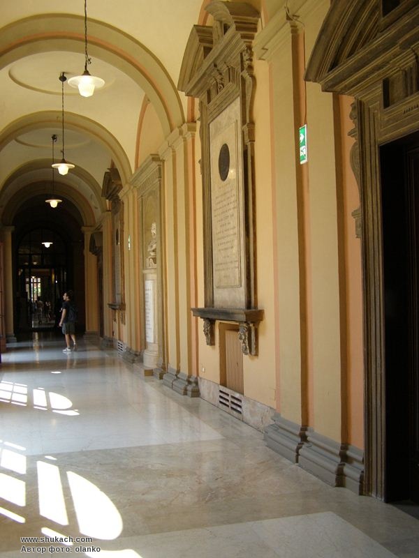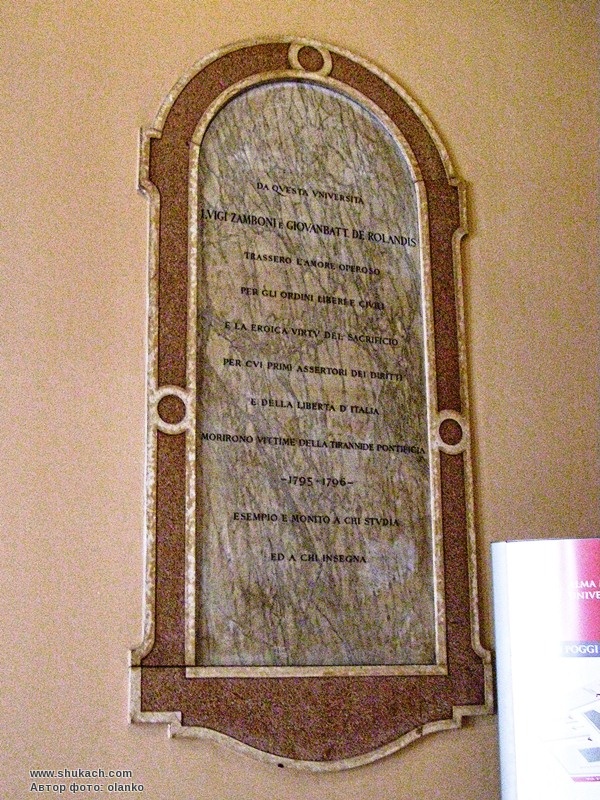 Мармурова дошка у камяній фігурній рамі встановлена у коридорі університету на честь студентів Луїджі Замбоні і Джованні Баттіста де Роландіса, борців за незалежність Болоньї від папської влади. Учасники невдалого заколоту, вони віддали життя за свої ідеали. Один був вбитий у в’язниці у 1795 році (за іншими джерелами, покінчив життя самогубством, не витримавши тортур), а інший страчений за вироком суду у 1796 році.