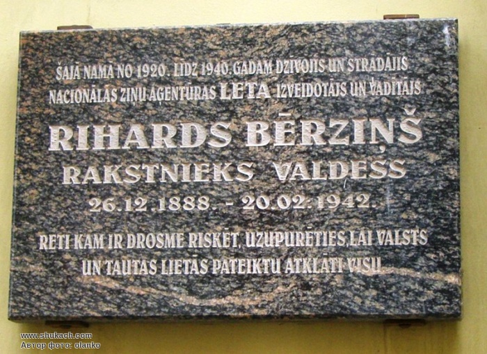 Встановлена на честь засновника і керівника національного інформаційного агентства LETA Ріхарда Берзіньша, який жив і працював у цьому будинку у 1920-1940 роках. «Небагато хто має сміливість ризикувати і йти на жертви, щоби відкрито говорити про справи держави і народу».