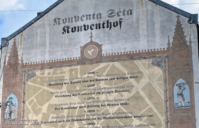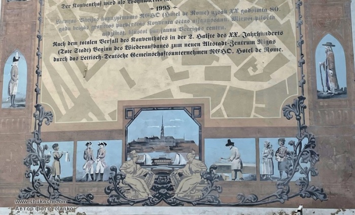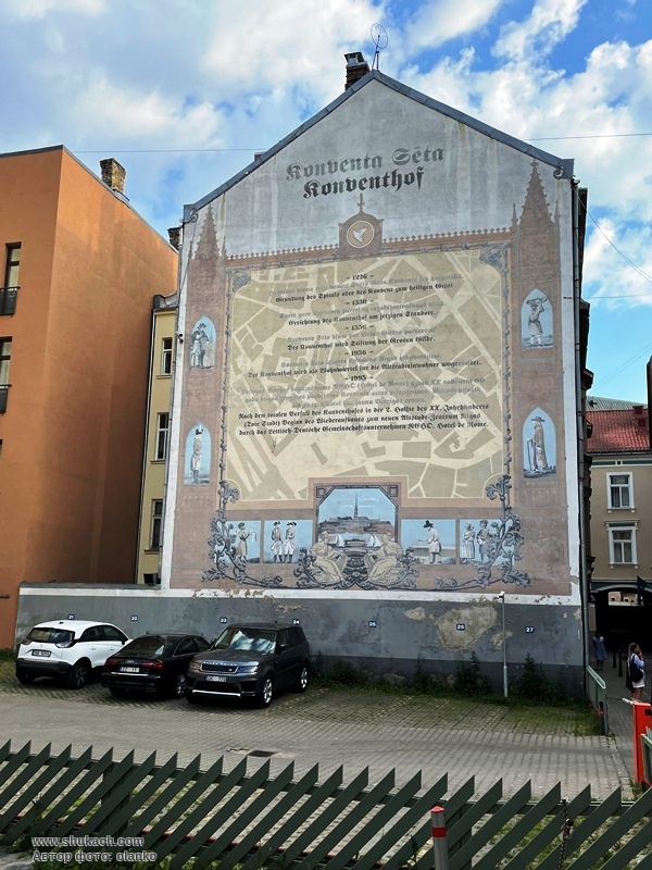 Мурал на глухій стіні колишнього монастиря містить основні історичні дані про його розвиток та ілюстрації середньовічних часів на фоні плану Старого міста. Відреставрована будівля переформатована у готель і знов відкрита 14 грудня 1996 року. Надписи латиською та німецькою мовою.