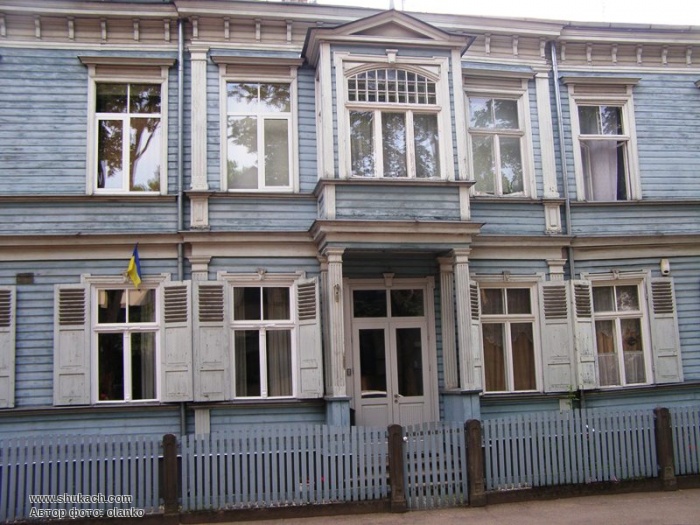 Вхідний портал цього будинку виділений квадратними профільованими колонами і прямокутним еркером над входом.
