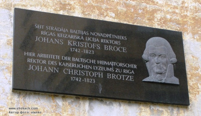 Встановлена на фасаді колишнього імператорського ліцею на честь ліфляндського педагога, історика і етнографа, ректора ліцею Іоганна Крістофа Бротце. Бронзовий рельєфний портрет на гранітній дошці. Автор – латиський медальєр і художник Яніс Струпуліс. Текст на латиській і німецькій мовах. Урочисто відкрита у 1996 році.