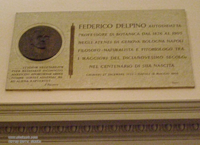 Встановлена у коридорі університету на честь видатного італійського ботаніка Федеріко Дельпіно, професора Болонського університету, президента Італійського ботанічного товариства. Бронзовий медальйон на мармуровій дошці.