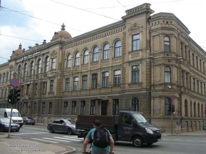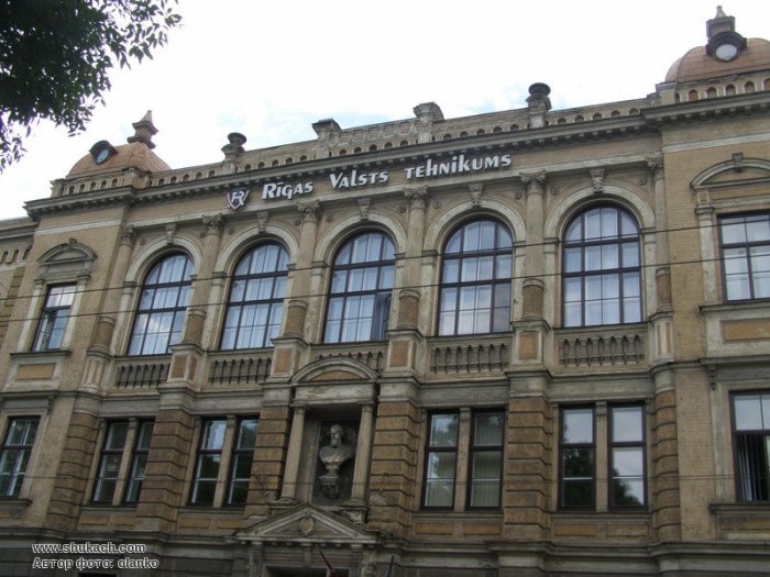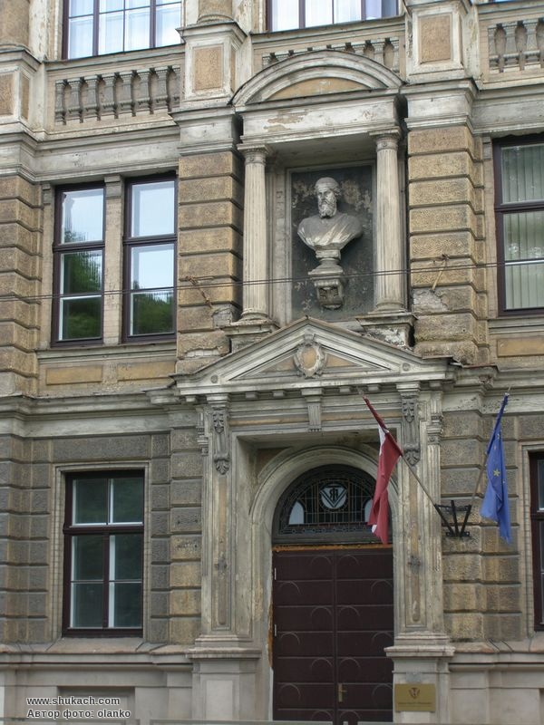 Будівля зведена у 1891 році за проектом архітектора А.Кізельбаша для Ризької гімназії імені імператора Миколи І. Зараз тут розміщений Ризький державний технічний університет. Пам’ятка архітектури. Про погруддя на фасаді думки краєзнавців розходяться. Хтось вважає, що це Аристотель, хтось називає його Платоном, а хтось – Архімедом.