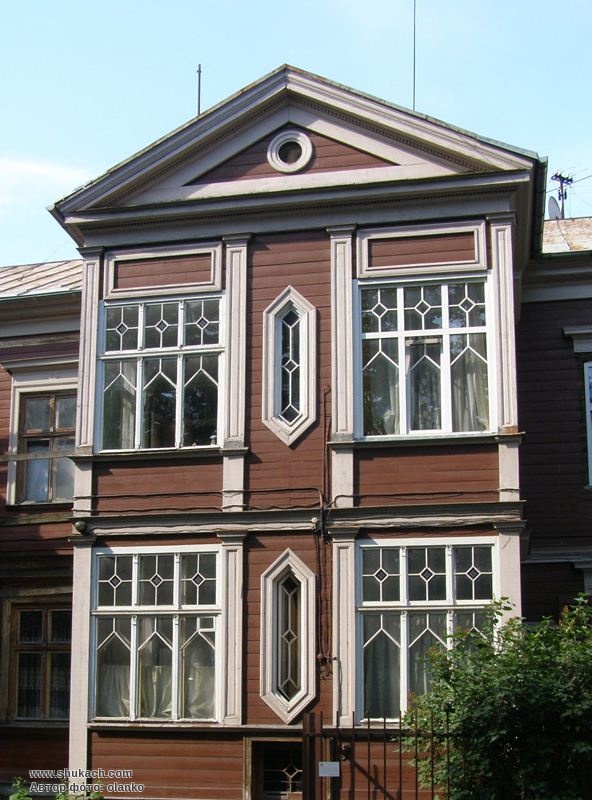Входи до цього будинку винесені на фланги, а центральний ризаліт, який значно висунутий вперед, має вузькі шестикутні вікна.