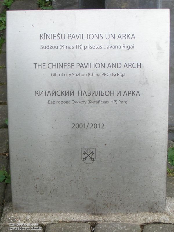 Поряд з павільйоном встановлений бетонний постамент із замурованою в нього чорною кам'яною плитою, на якій викабувано дарчий напис китайською та латиською мовами: «На честь 800-річчя міста Риги від керівництва міста Сучжоу, Китайська Народна Республіка».
