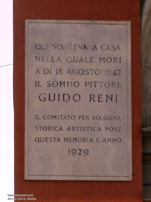 Встановлена комітетом Болоньї по історії і мистецтву у 1929 році на честь видатного болонського художника 17-го століття Гвідо Рені. Текст: «Тут стояв будинок, в якому 18 серпня 1642 року помер великий художник Гвідо Рені».