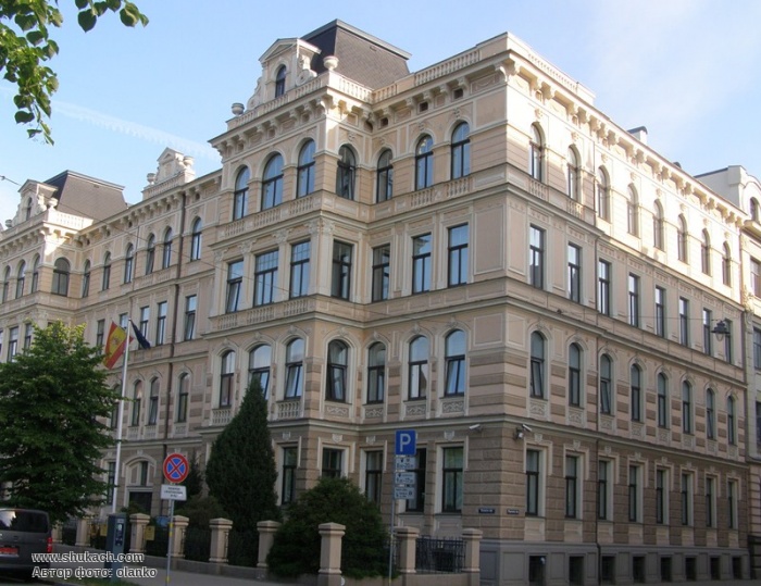 Чотириповерховий прибутковий будинок в еклектичному стилі зведений у 1897 році за проектом архітектора Віктора Лунскіса. В плані квадратний, з внутрішнім подвір’ям. Має два бічних ризаліти, завершені квадратними декоративними вежами. Перший поверх рустований. Фасад прикрашений балюстрадами, профільованими пілястрами, різноманітною ліпниною. Зараз в будинку розміщені амбасади Іспанії і Греції.