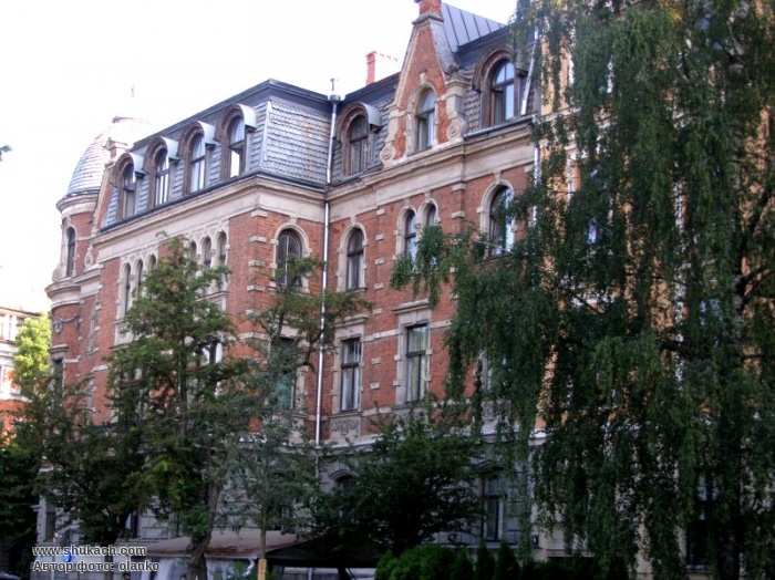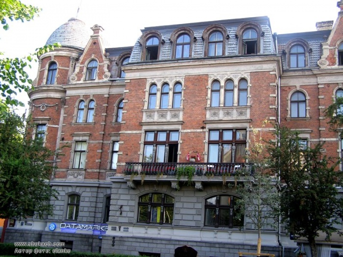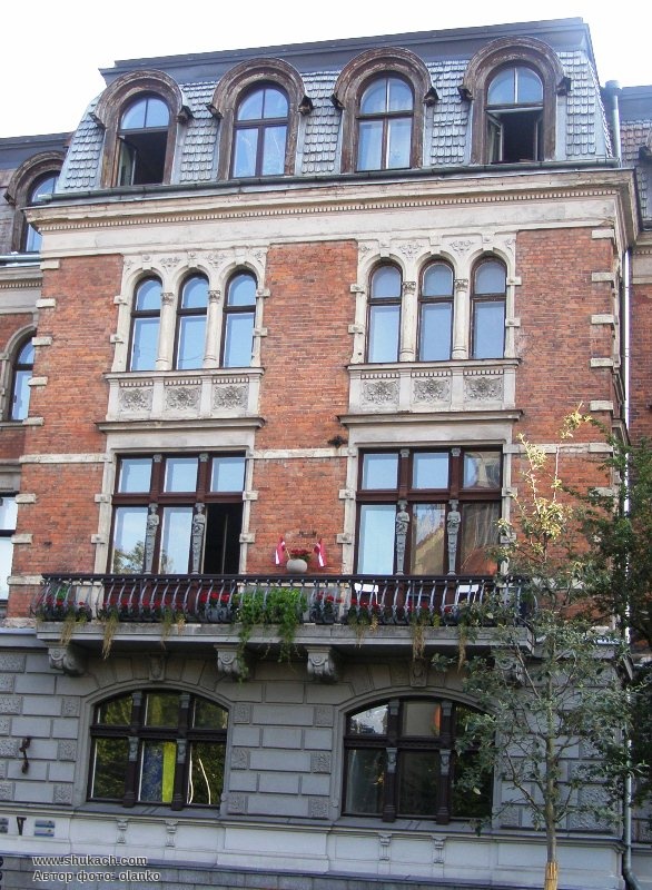 Триповерховий прибутковий будинок в еклектичному стилі з цокольним і мансардним поверхами на розі вулиць Елізабетес і Аукселя зведений у 1898 році за проектом архітектора Германа Отто Хілбіга. Перший поверх рустований. Фасад з червоної цегли підкреслює біле кам’яне обрамлення вікон і вхідних порталів. Він прикрашений пласкими пілястрами, ліпними маскаронами, гірляндами, раковинами, картушами. Наріжжя завершує вкрита «лускою» кругла вежа з флюгером.
