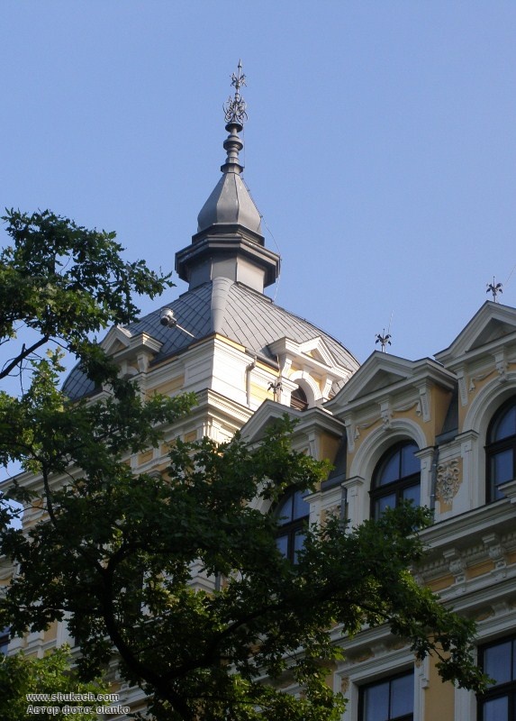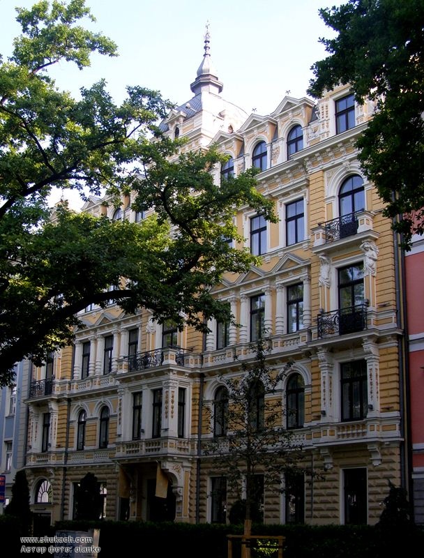 П’ятиповерховий прибутковий будинок в еклектичному стилі зведений у 1899 році за проектом архітектора Карла Йоганна Фельско. Над скульптурами фасаду працював скульптор Август Фольц. Перші два поверхи рустовані. Фасад прикрашений балконами з жіночими і чоловічими скульптурами і кованими ажурними гратами. На огорожі центрального балкону – кований вензель власника будинку. Вікна другого поверху аркові, третього – з трикутними сандриками, четвертого – з прямими. Центральний ризаліт завершує декоративна вежа. В радянські часи – готель «Даугава», пізніше – «Бака».