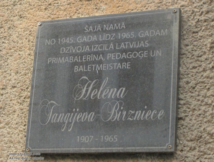Встановлена в пам'ять видатної латвійської балерини, балетмейстера і педагога Хелени Тангієвої-Бірзнієце, яка жила в цьому будинку у 1945-1965 роках.