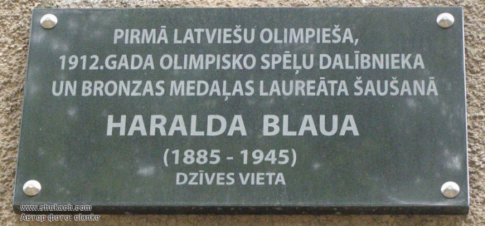 Встановлена на честь першого латиша – призера Олімпійських ігор сучасності Харальда Блауса, який у 1912 році на Олімпійських іграх у Стокгольмі завоював бронзову медаль в стендовій стрільбі. Меморіальна дошка на фасаді будинку, де він жив, урочисто відкрита 30 листопада 2012 року.