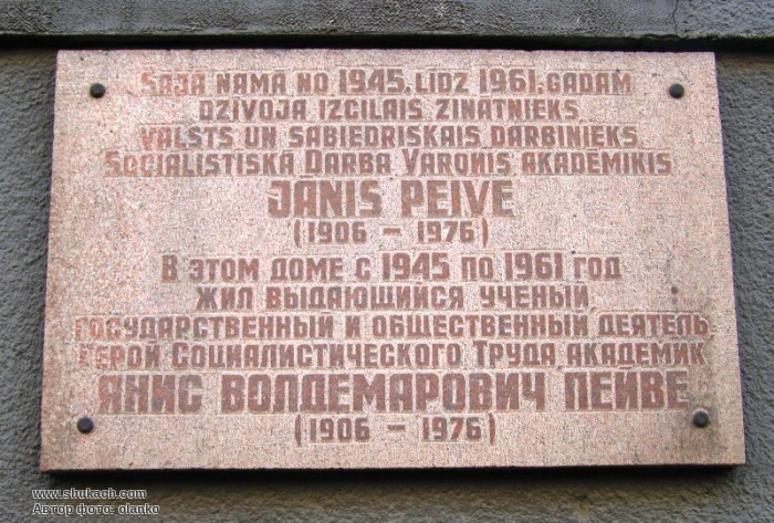 Дошка з рожевого граніту встановлена на будинку, де у 1945-1961 роках жив видатний вчений-агрохімік, академік і президент Академії наук (1951-1958), голова Ради міністрів Латвійської РСР (1959-1966) Я.В.Пейве.