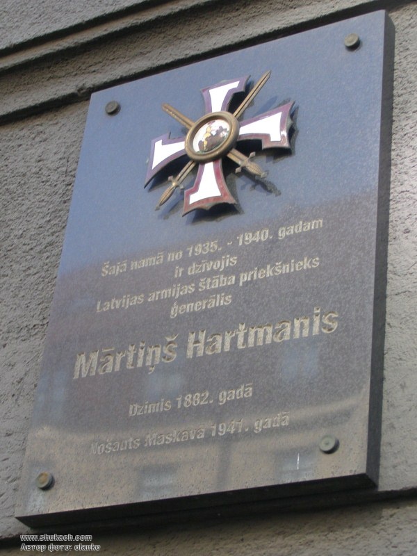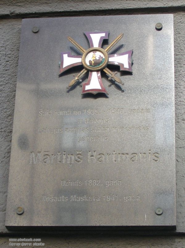 В цьому будинку у 1935-1940 роках жив Мартіньш Хартманіс, військовий діяч, генерал Латиської армії, жертва сталінського терору. На гранітній дошці – рельєфне металеве зображення латвійського ордена Лачплесіса, яким був нагороджений М.Хартманіс.