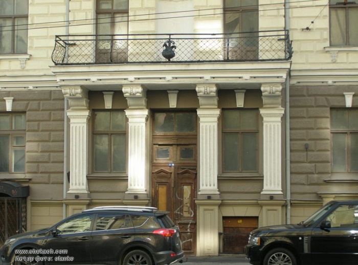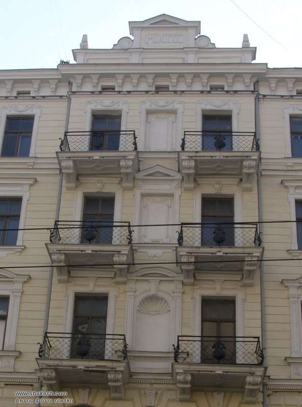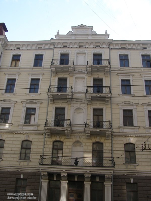 П’ятиповерховий прибутковий будинок в стилі неокласицизму зведений у 1904 році за проектом архітектора Едмунда фон Тромповскі. Фасад рустований (на верхніх поверхах руст тільки горизонтальний), прикрашений балконами на широких консолях, з ажурними кованими гратами. Вхідний портал має чотири профільованих пілястри. В лівій частині фасаду – прямокутний еркер на чотири поверхи, завершений декоративною вежею.