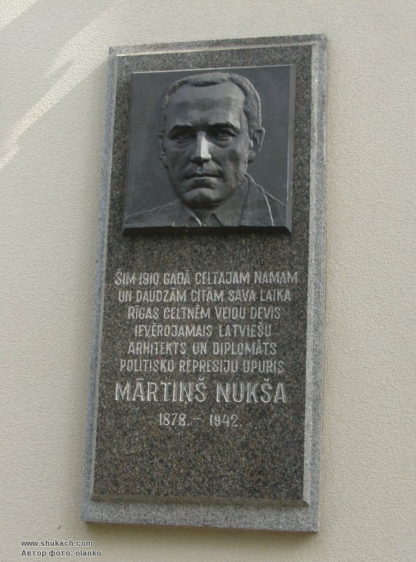 Встановлена на честь видатного латиського архітектора і дипломата, жертви сталінських репресій Мартіньша Нукши. Цей будинок, зведений за власним проектом у 1910 році, належав йому. Бронзовий барельєфний портрет на гранітній дошці.
