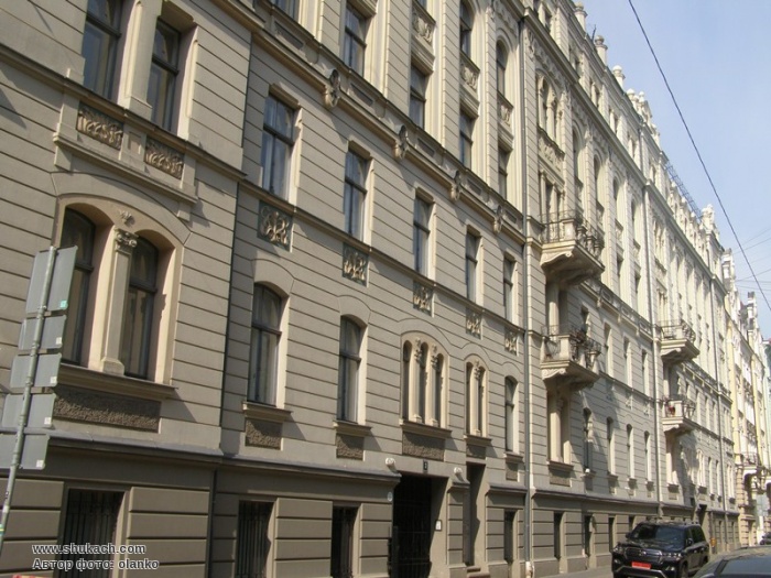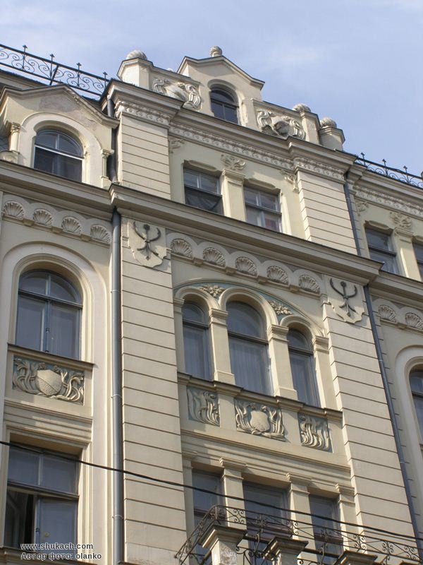 Це перший будинок, що був зведений на вулиці Альберта. У 1900 році він був побудований за проектом архітектора Фридриха Шеффеля. Фасад має горизонтальний руст. Він прикрашений рельєфними вставками, балконами на фігурних консолях, ліпними мушлями і дрібними деталями рослинних мотивів, скульптурними гербами власника будинку - щита з діагональною смугою. Такий самий щит тримає в лапах скульптура лева на даху будинку. Пам’ятка архітектури.