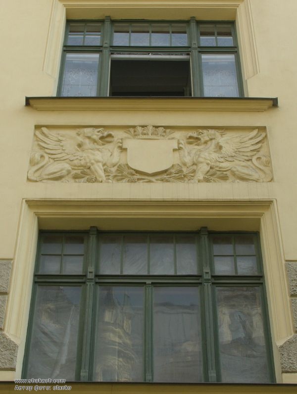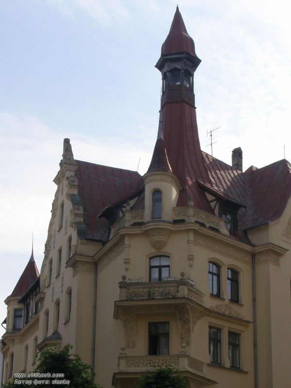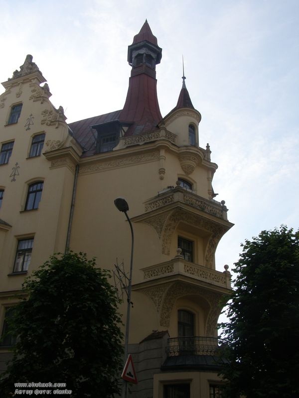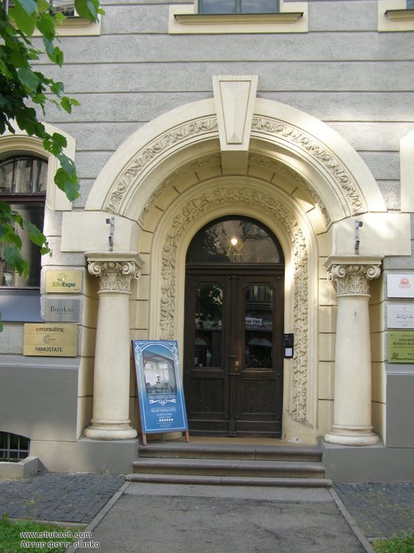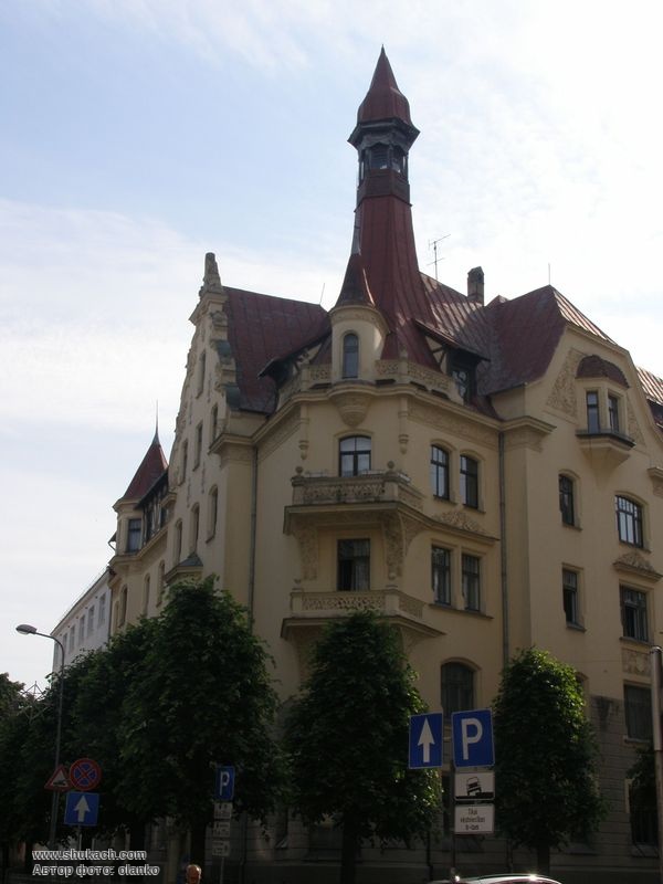 Яскравий зразок національно обумовленої реакції на скандинавський північний модерн. Будинок зведений з використанням структурних та декоративних елементів латиського національного романтизму. Будівлю характеризує елегантний прийом структурної організації — імітований фахверк над верхніми поверхами, застосований тут як чисто декоративний елемент. Наріжний ризаліт багато декорований рослинним орнаментом (соснові гілки) із зображеннями білок та кльостів, ніби інкрустованих у сосновий декор. Симпатична кутова вежа також надсилає будинок до концепції національного романтизму.