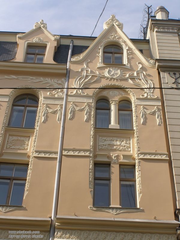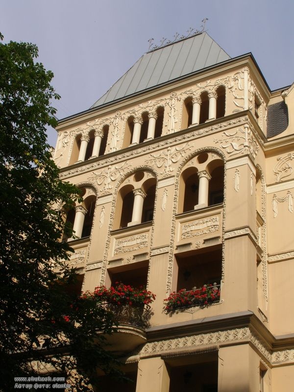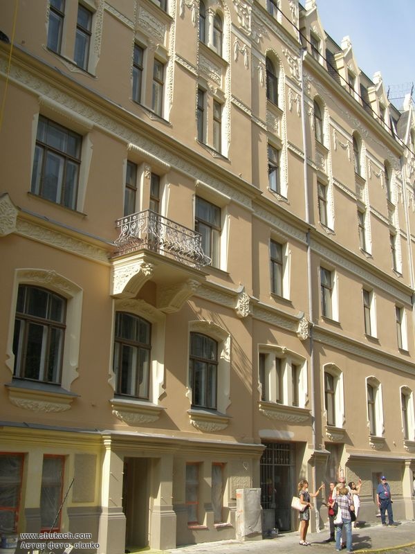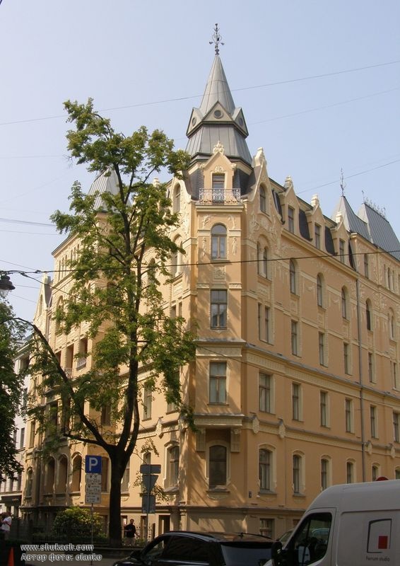 Чотириповерховий прибутковий будинок на розі вулиць Альберта і Антоніяс зведений у 1901 році за проектом архітекторів Генріха Шеєля і Фридриха Шеффеля. Фасади будинку прикрашені балконами з ажурними кованими гратами, різноманітною ліпниною. Фасад по вулиці Антоніяс має центральний ризаліт з лоджіями. Зрізане наріжжя завершено декоративною гострою вежею (під час фотографування йшов ремонт наріжної частини). У 2009 році будинок був відреставрований. Пам’ятка архітектури.